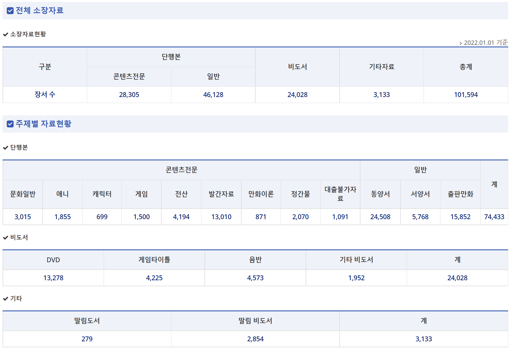 종합자료실은 1층에 있었는데, 공간이 생각보다 협소했다. 공간이 작은 만큼 장서량도 눈에 띄게 적었다. 2020년 1월 기준으로(홈페이지의 도서관 자료현황은 왜 지난 2년간 업데이트 되지 않았는가...) 총 장서량 63,108권에 일반도서는 20,667권 수준. 아동도서가 일반도서보다 많다(2.5만 권)는 것이 특징이다.