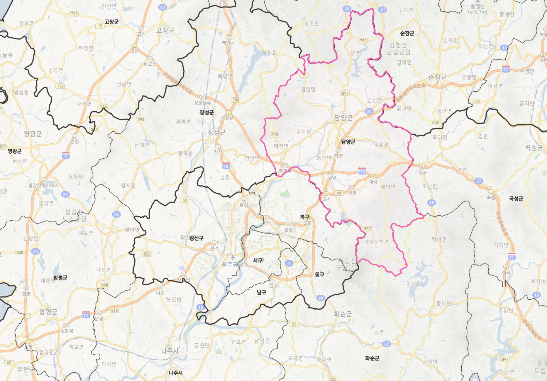 담양군은 광주 북구와 화순군, 곡성군, 순창군, 장성군을 면하고 있는 지역이다. 메타세쿼이아 길이나 죽녹원, 죽제품이 유명해서인지 초록초록한 이미지의 지역이다.