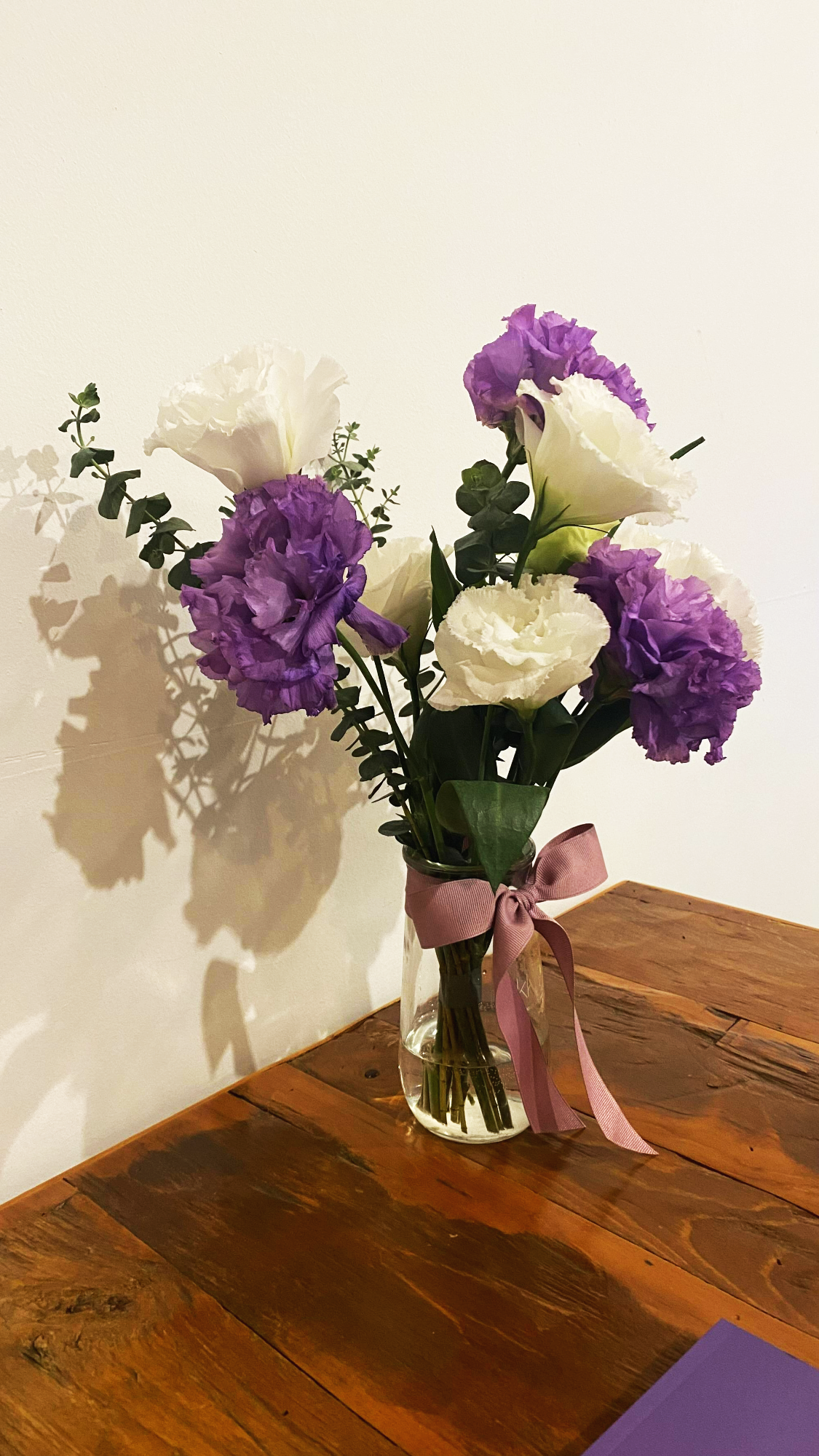 꽃병에 꽂혀있는 보라색과 흰색 꽃, 이름이 뭘까? 예쁘다 예뻐.